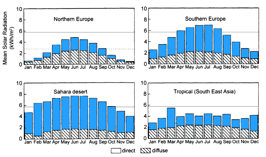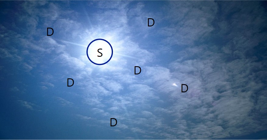 Diffuse (D): after scattering and reflection by the Earth’s atmosphere and nearby objects.