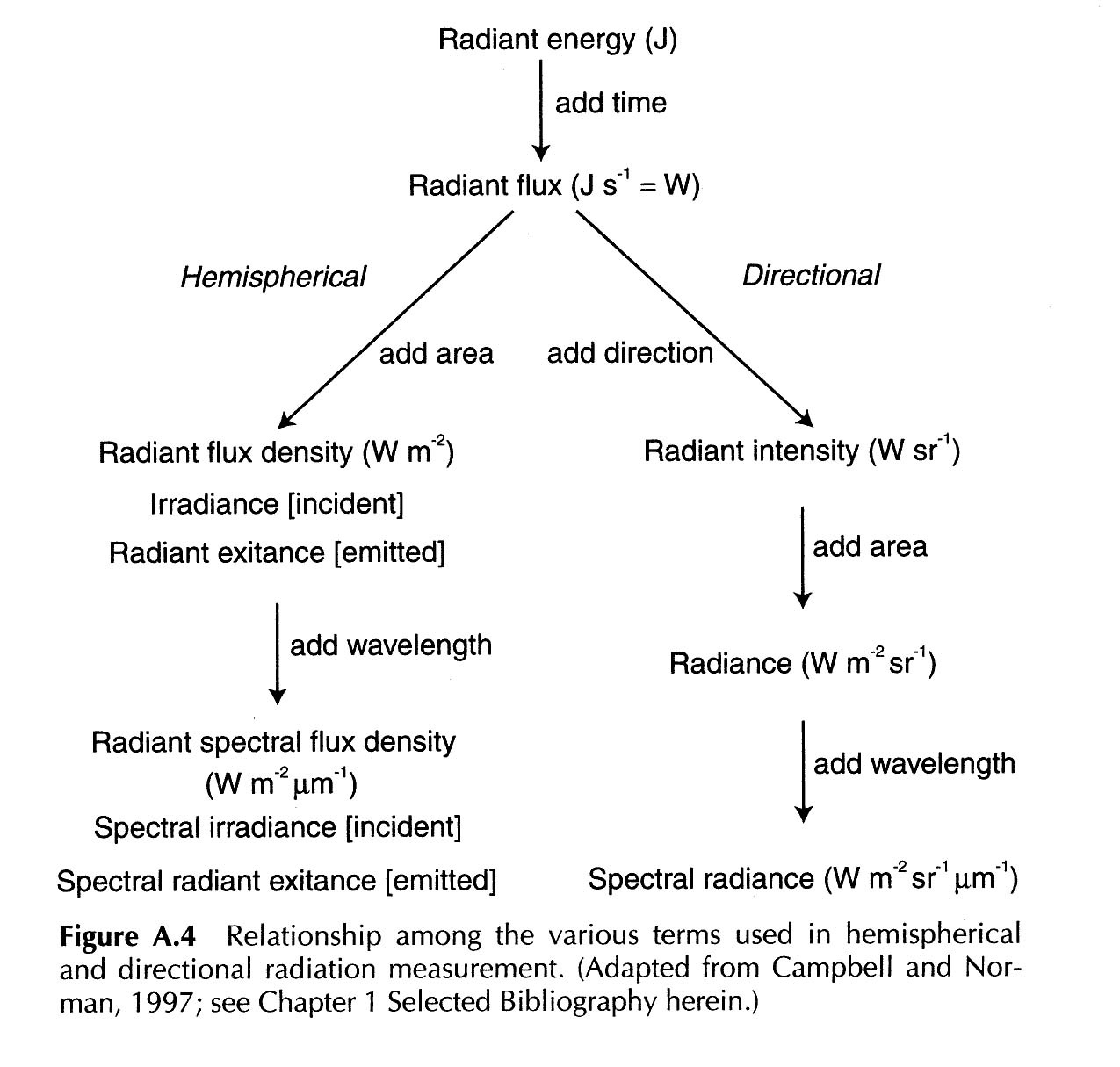 Relationship among the various terms used in hemispherical and directional radiation measurements (Adapted from Campbell and Norman, 1997)