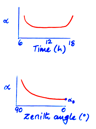 Bulk transmissivity of the atmosphere (\(\Psi_a\)) depends on turbidity of the air (scattering + absorption) and path length trough the atmosphere.
