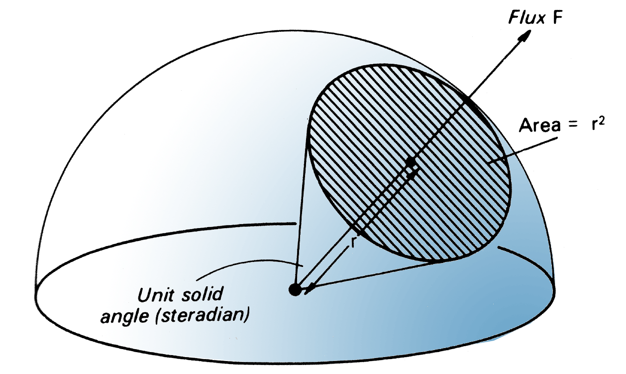 Radiant intensity is the radiation flux per unit \(sr\) from a point source. The unit of radiant intensity is W sr-1