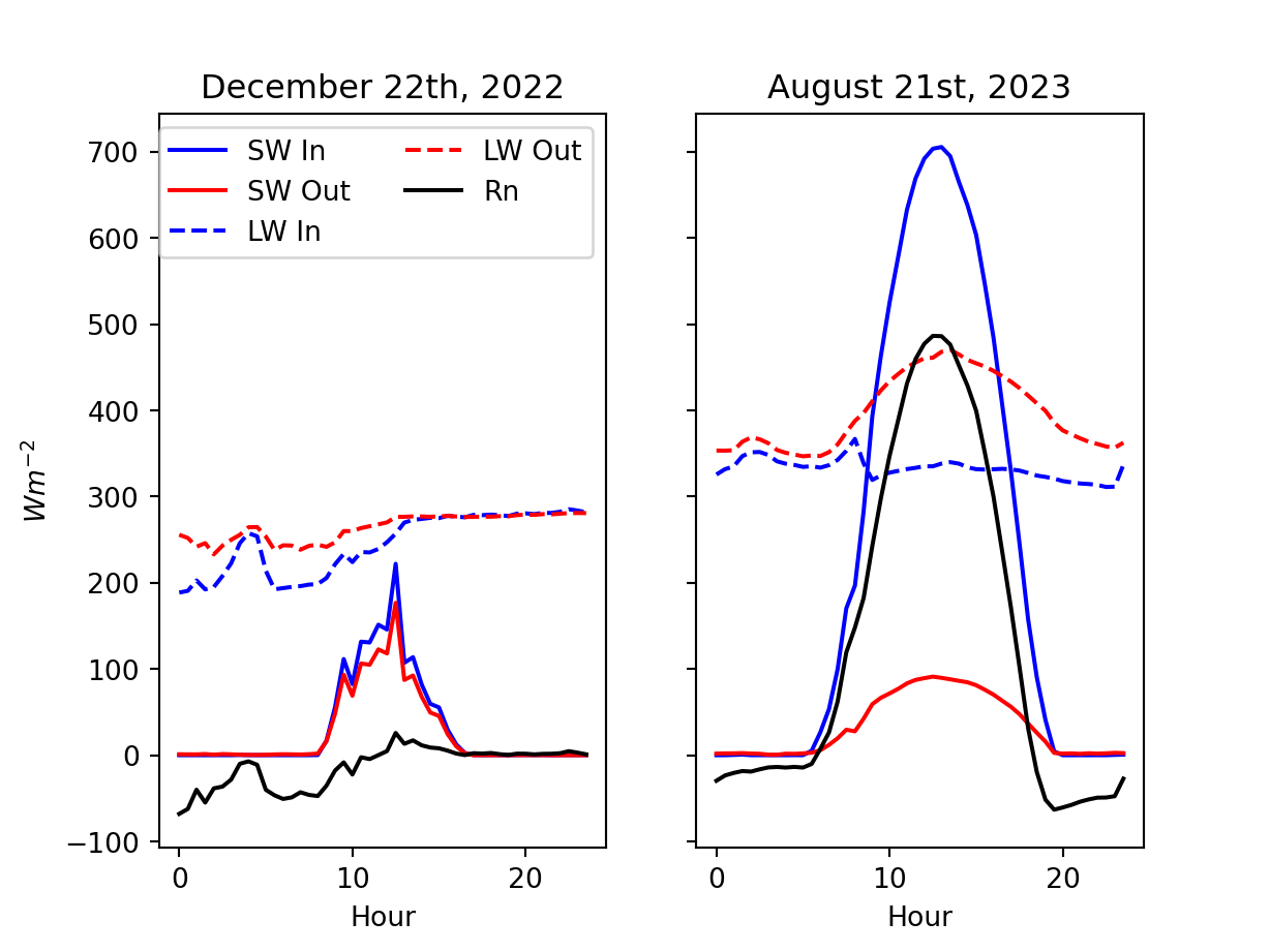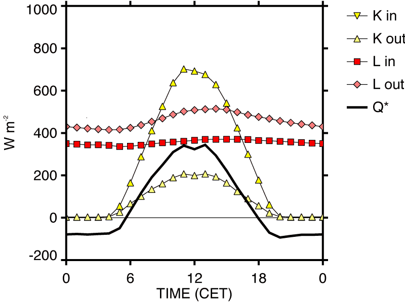 It can be alternatively partitioned as the sum of net short-wave radiation (\(SW^*\)) and net long-wave radiation (\(LW^*\)):