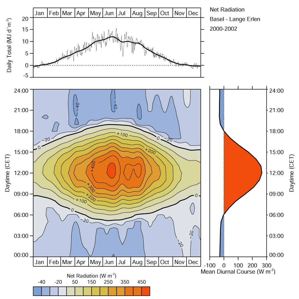 Temporal and spatial differences in net all-wave radiation are controlled by the distribution of short-wave irradiance, atmospheric conditions (clouds) and surface properties.