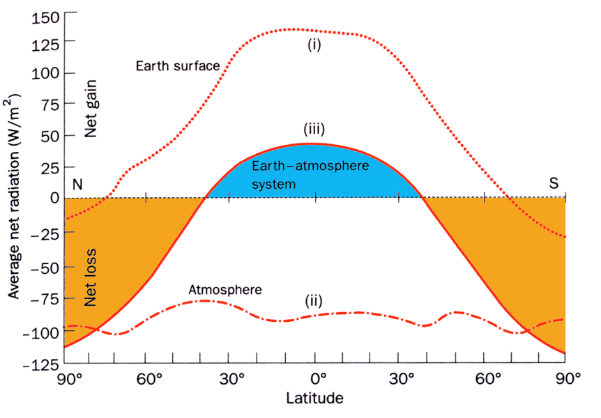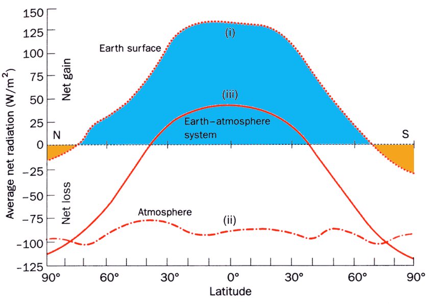 At the equator: if mean daily \(R_n\) at the ground surface (0 m) m over is 125 W m-2 and mean \(R_n\) at the tropopause (17,000 m) is -100 W m-2, how much radiative cooling would we expect over the depth of the troposphere?