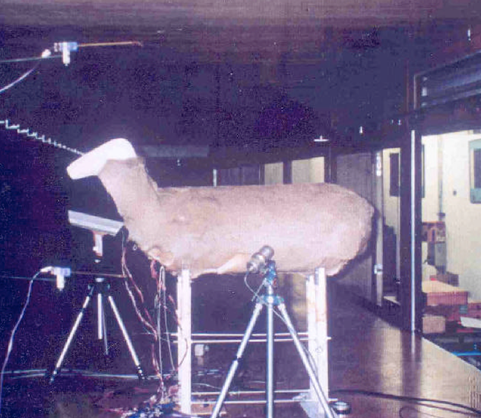 Artificial deer in the UBC Mechanical Engineering wind tunnel with infrared thermometers (Photo: A. Black, UBC)