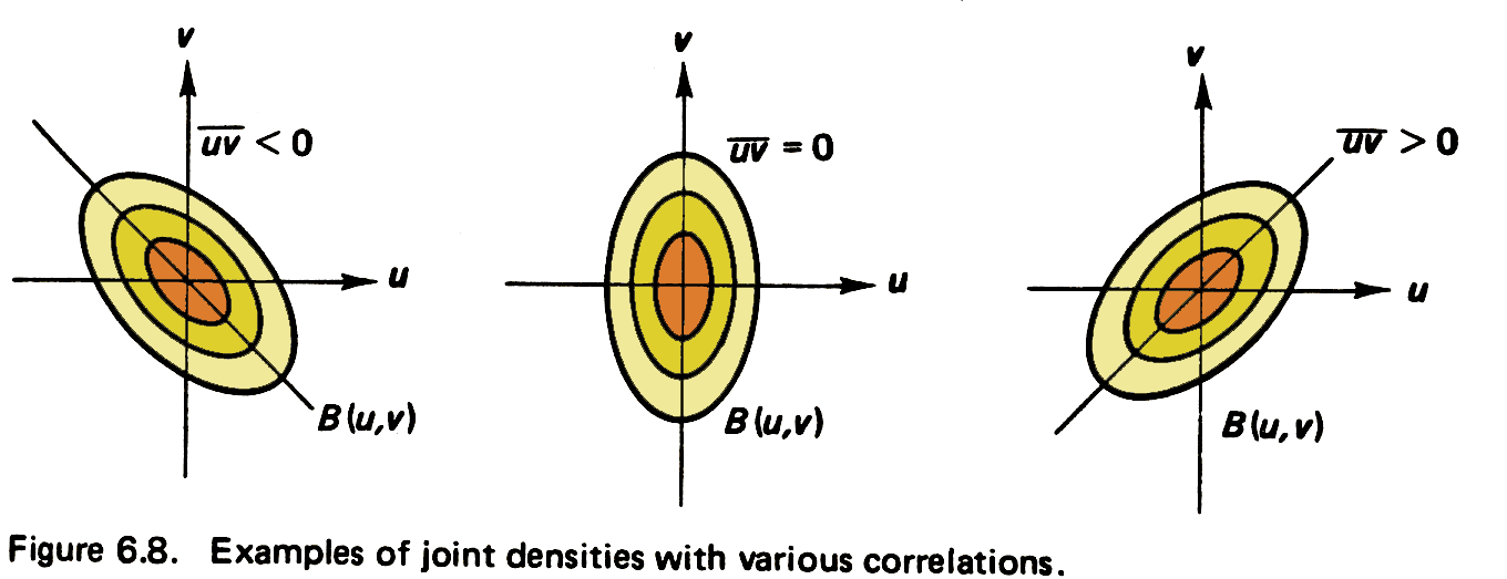 Correlation coefficient is defined as the covariance normalized by the standard deviations for the two variables. Normalizing means -1=> r +< 1. A correlations coefficient of 1 indicates a perfect correlation (both variables increase or decrease together proportionally), -1 means a perfect opposite correlation, and 0 indicates no correlation. Joint probability density. Note the asymmetric PDF –By inspection, note that the larger probabilities occur as X and Y move in opposite directions. This indicates a negative covariance. All values of ruw are well negatively correlated (average -0.3) because wind increases with height In the ABL, many turbulent variables are correlated. E.g. in unstable conditions, parcels of warm air rise while other cool parcels sink in convective circulation (e.g. w’theta’ = postive) The closer the correlation is to 1 or −1, the closer the joint distribution of (x,y) pairs hugs a straight line, with positive or negative slope.