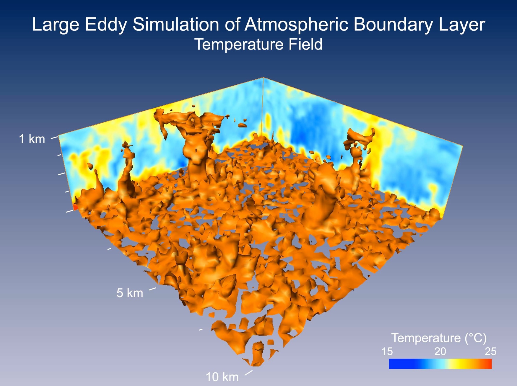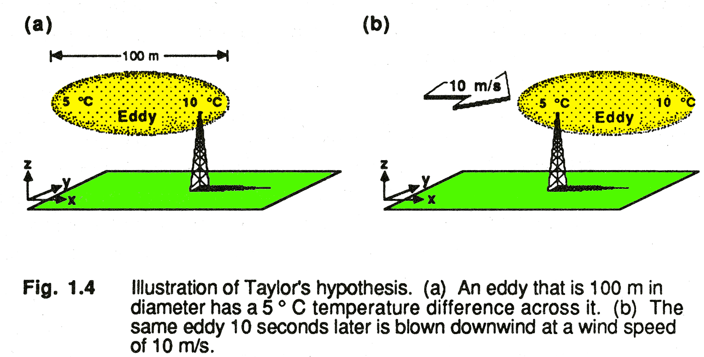 Take a variable like temperature, T. We know that the change in T with time at any location (such as where a sensor might be placed) is the sum of the total derivative and the temperature advection: The temperature advection is the change in temperature at the sensor due to the advection of warmer or colder air past the sensor. The total derivative is the change in temperature of an air parcel moving past the sensor. Such a temperature change may be caused by any number of processes, such as the absorption or emission of radiation, condensation or evaporation (latent heating or cooling), or compression and expansion. Taylor’s hypothesis says that we can assume that the turbulent eddies (which we can think of as large air parcels) are frozen as they advect past the sensor and thus the change in temperature within each eddy is negligible: The temperature advection is the change in temperature at the sensor due to the advection of warmer or colder air past the sensor. The total derivative is the change in temperature of an air parcel moving past the sensor. Such a temperature change may be caused by any number of processes, such as the absorption or emission of radiation, condensation or evaporation (latent heating or cooling), or compression and expansion. Taylor’s hypothesis says that we can assume that the turbulent eddies (which we can think of as large air parcels) are frozen as they advect past the sensor and thus the change in temperature within each eddy is negligible: