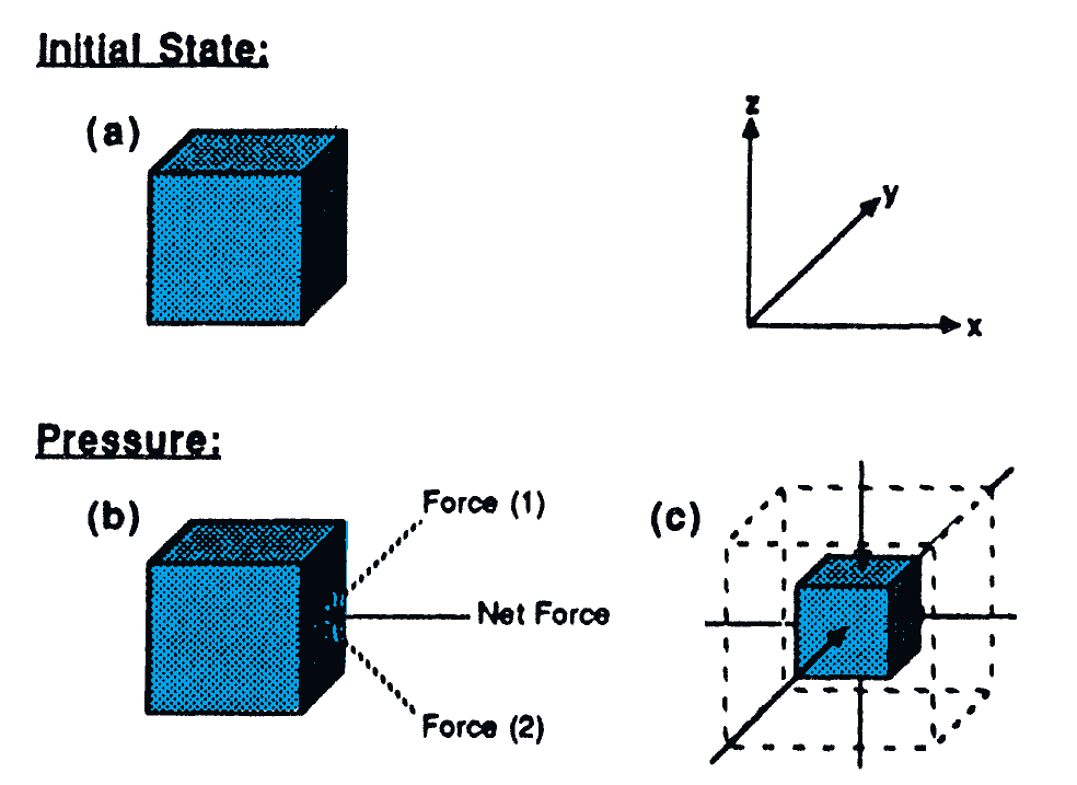 At a point, pressure acts isotropically and normal to the surface (normal force per unit area). Because it is not dependent on direction, pressure can be reduced to the scalar \(P\).