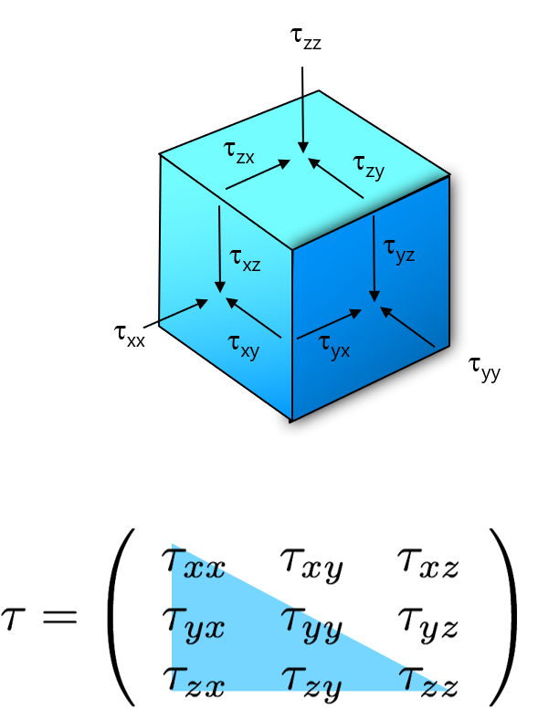 In a three dimensional view, we can define a stress tensor \(\tau\) that deforms a body