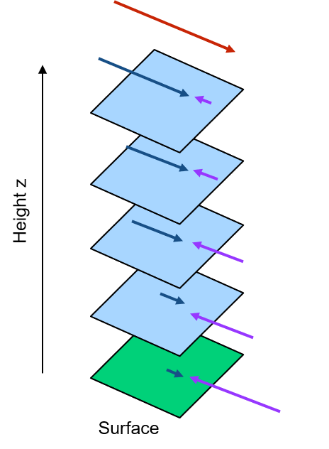 Assuming horizontal homogeneity: In turbulent shear flows, the Reynolds stress (momentum flux) is found to be proportional to the square of the mean flow velocity, which leads to the definition of the friction velocity \(u_*\) (units: m s-1)