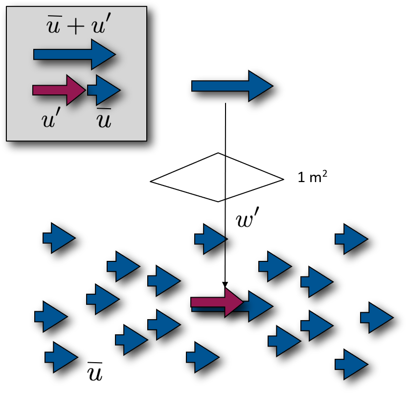 The flux of momentum is accomplished through random motion. Discrete ‘lumps’ (eddies) of the fluid are displaced by turbulence over a distance and there merge with the flow. Consequently eddies transport their momentum surplus or their momentum deficit (${u}) across a distance.
