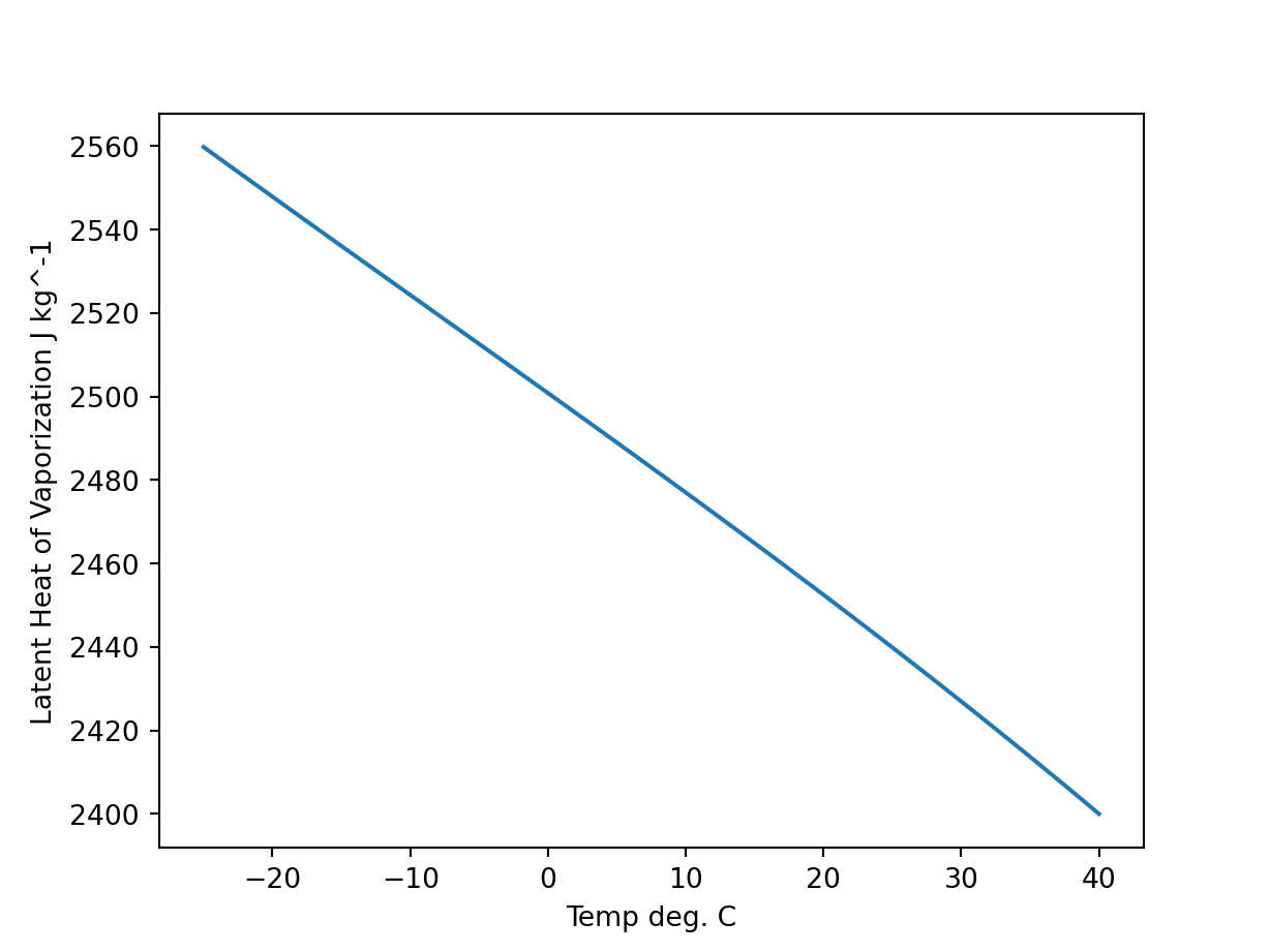 Following Yao & Rogers (1996), the latent heat of vaporization of water (\(L_v\) in \(J g^{-1}\)) can be approximated as a function of temperature (\(T\) in \(^{\circ}C\)) using a third order polynomial function:
