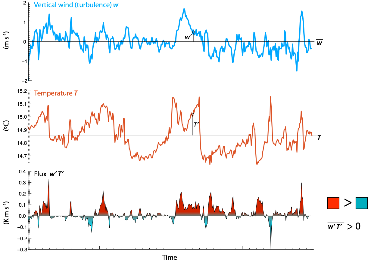 By simultaneously measuring vertical wind and a concentration, we can measure turbulent fluxes using the eddy-covariance technique.