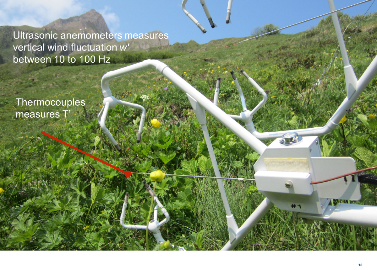 If we equip an eddy covariance system with an analyzer that measures fast fluctuations of the molar density of any trace gas \(\rho_c^{\prime}\) (e.g. µmol m-3) we can directly determine the gas-exchange (molar flux) between a land surface and the atmosphere: