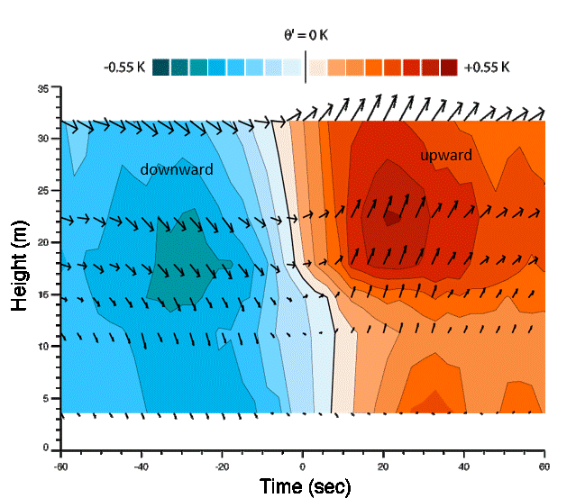 Simultaneous measurements at 6 heights on a tower of wind vector (arrows) and temperature (colors)