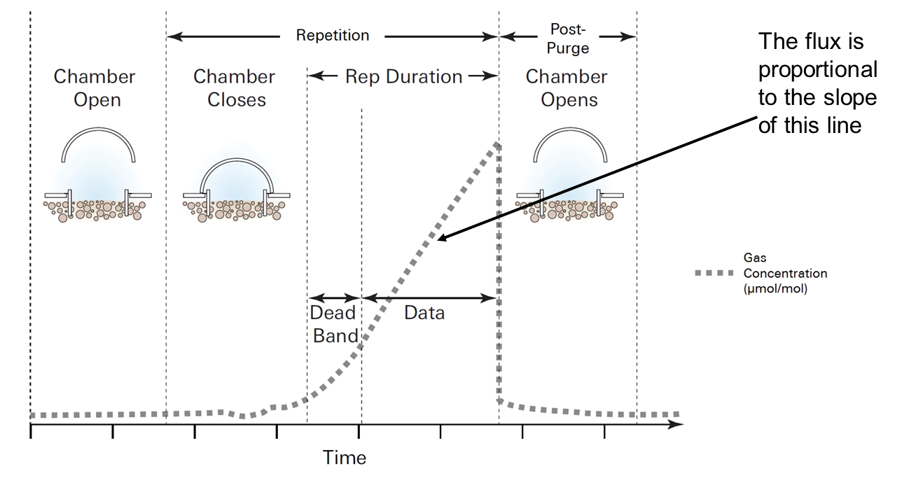 Fluxes are calculated based on the change in gas concentration over time (i.e., the slope of the line labeled data).