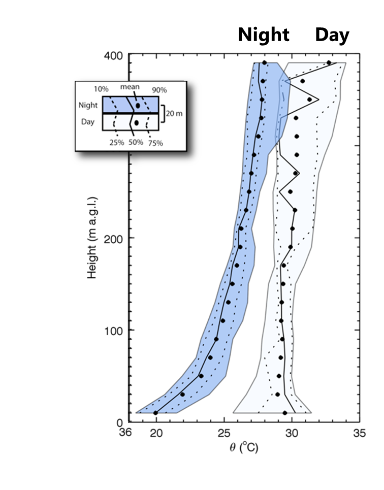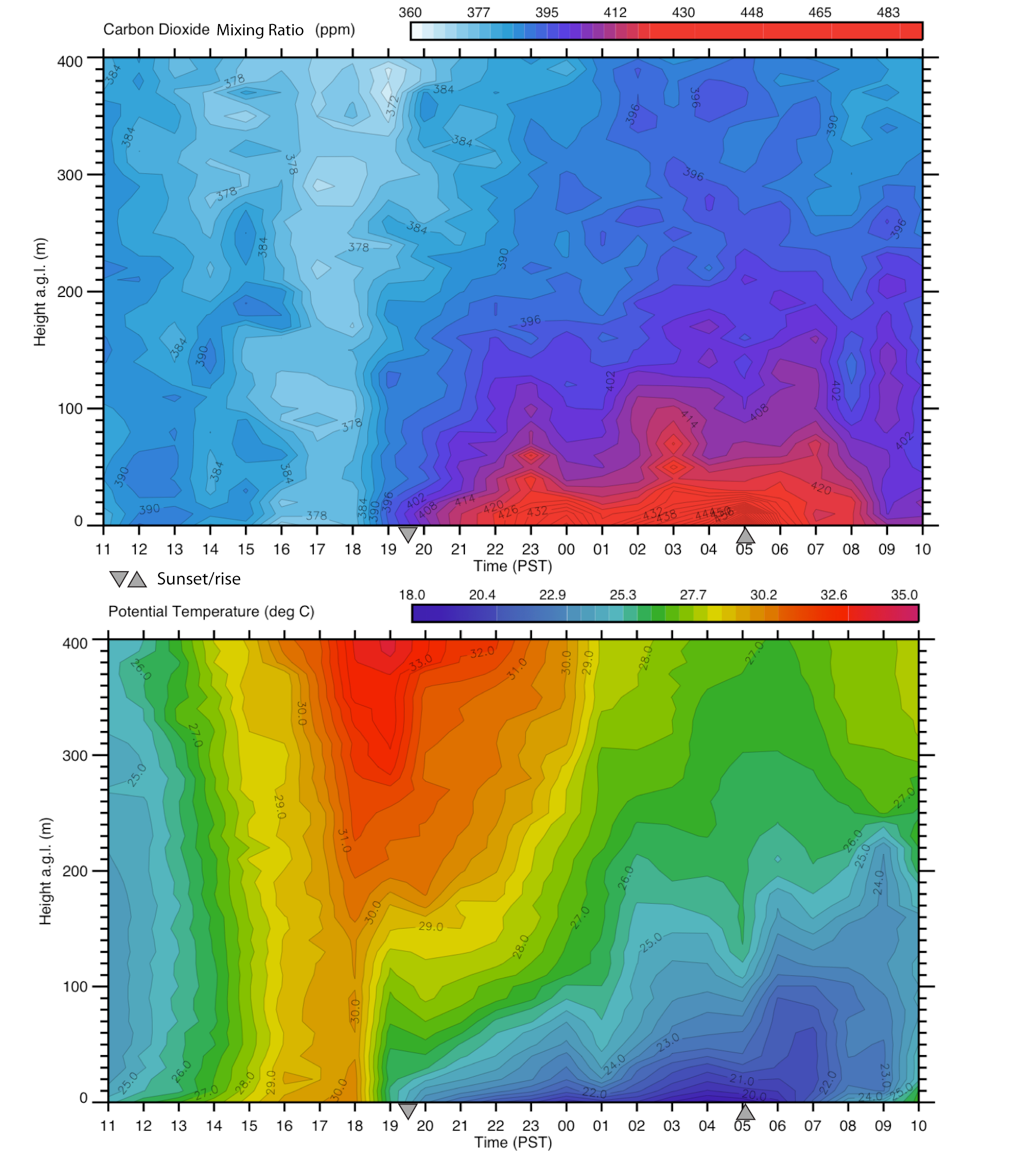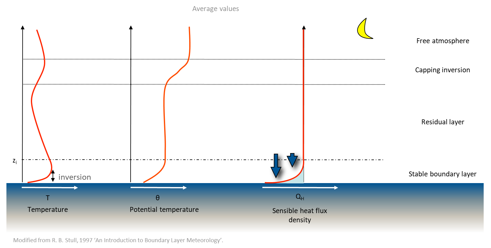 Potential temperature profile defines the depth of the stable boundary layer, but may be hard to identify top (merges) - typically 100 - 300 m on a clear sky night.