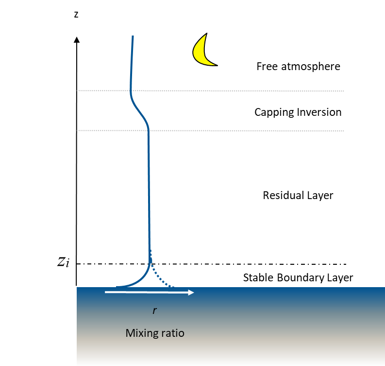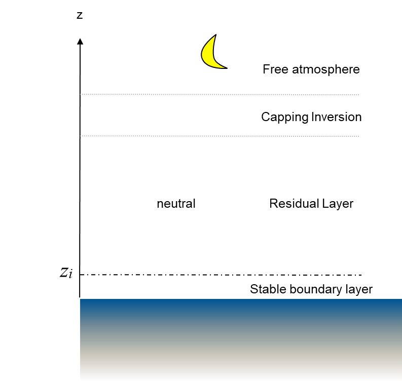 Above the stable boundary layer at the surface, weak mixing continues in remnants of previous day’s CBL, called the residual laye.