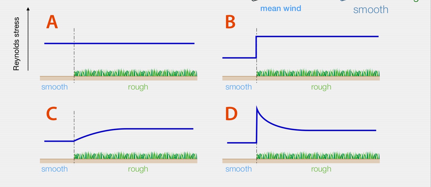 Reynolds stress \(\tau\) is strongest where mean wind and roughness are high (at the boundary)