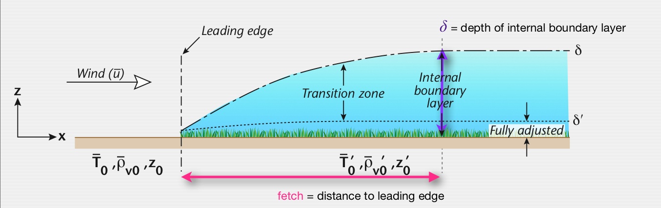 As air crosses a sharp change in surface properties (\(z_0\), \(T_0\), \(\rho_{v0}\), etc.); air immediately above is affected (due to turbulent exchange).