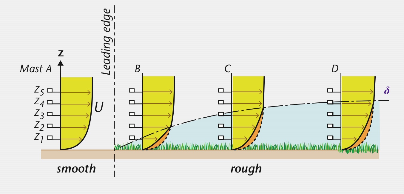 Modification affects a layer (\(\delta\)) known as the internal boundary layer as a function of greater distances (\(x\)) known as fetch)