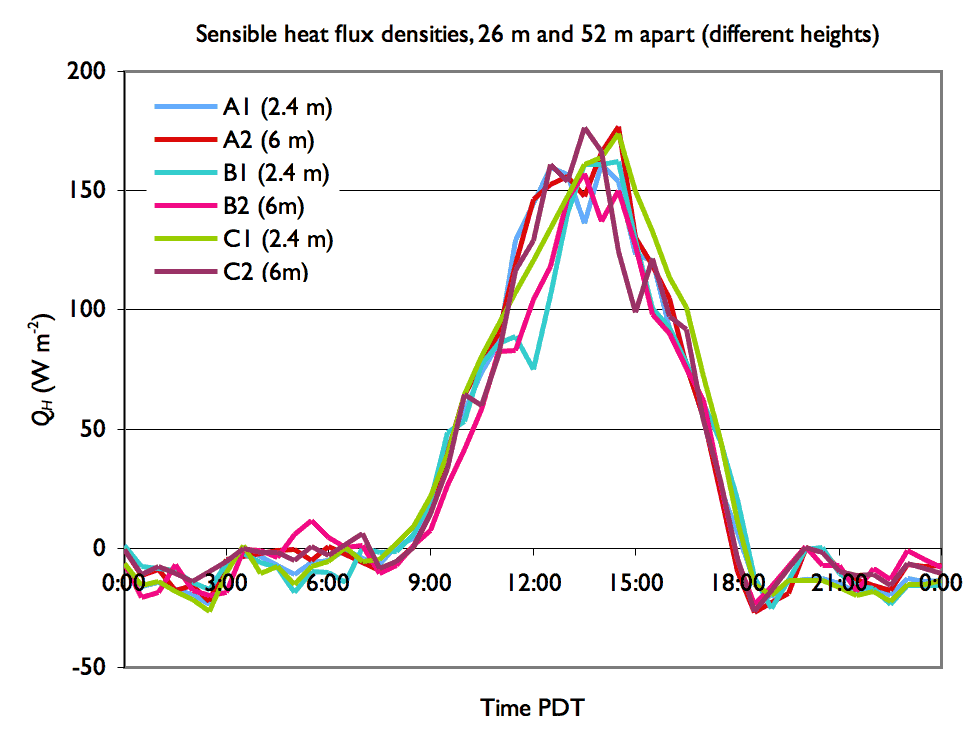 Even over ‘ideal’ flat, homogeneous and extensive sites, horizontal and vertical variability of \(\tau\), \(H\), \(LE\) etc. is in the order of 5 to 10%.