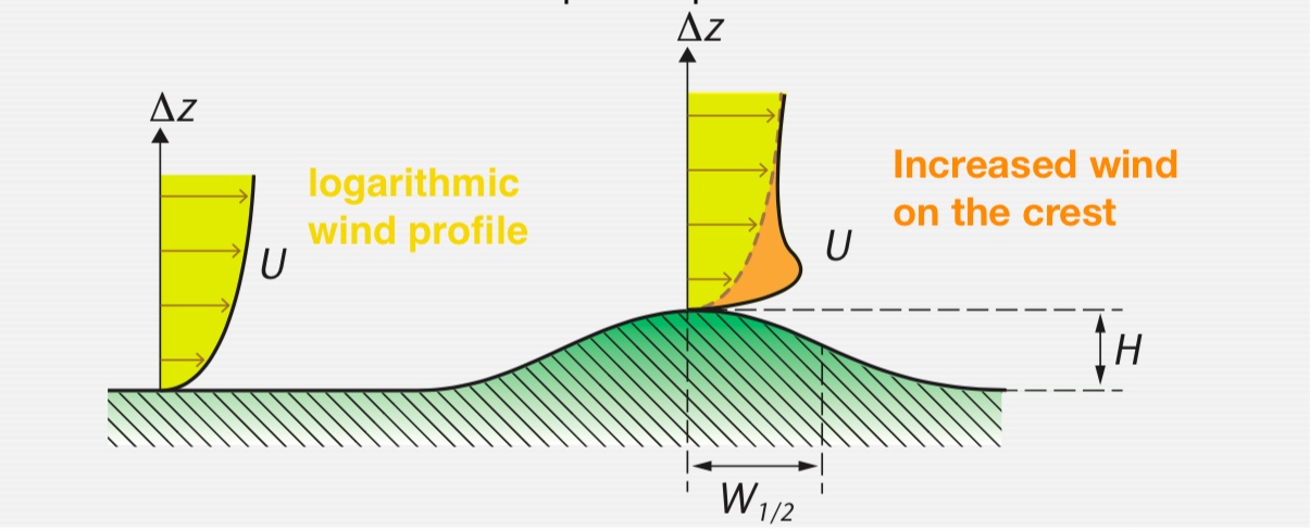 The vertical wind profile is modified in a way, so that near-surface horizontal winds over the hill are 1 to 3 times stronger compared to the situation over the flat plane upwind: