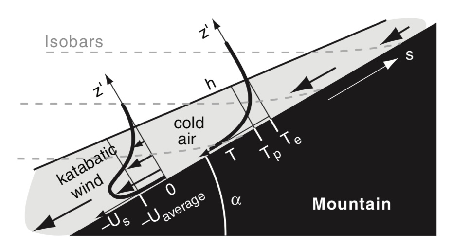 Katabatic flows over gently sloped terrain are nearly constant in wind speed and show little turbulence. The maximum wind speed is found just a few meters above the surface.