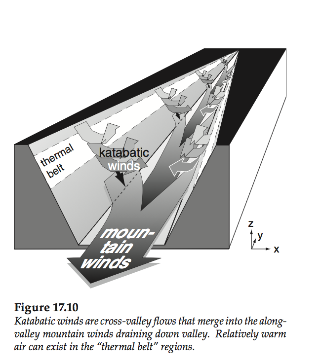 This creates horizontal temperature gradients and consequently pressure differences - along the valley’s axis and along slopes - that are the causation for two well known local thermo-topographic wind circulations: