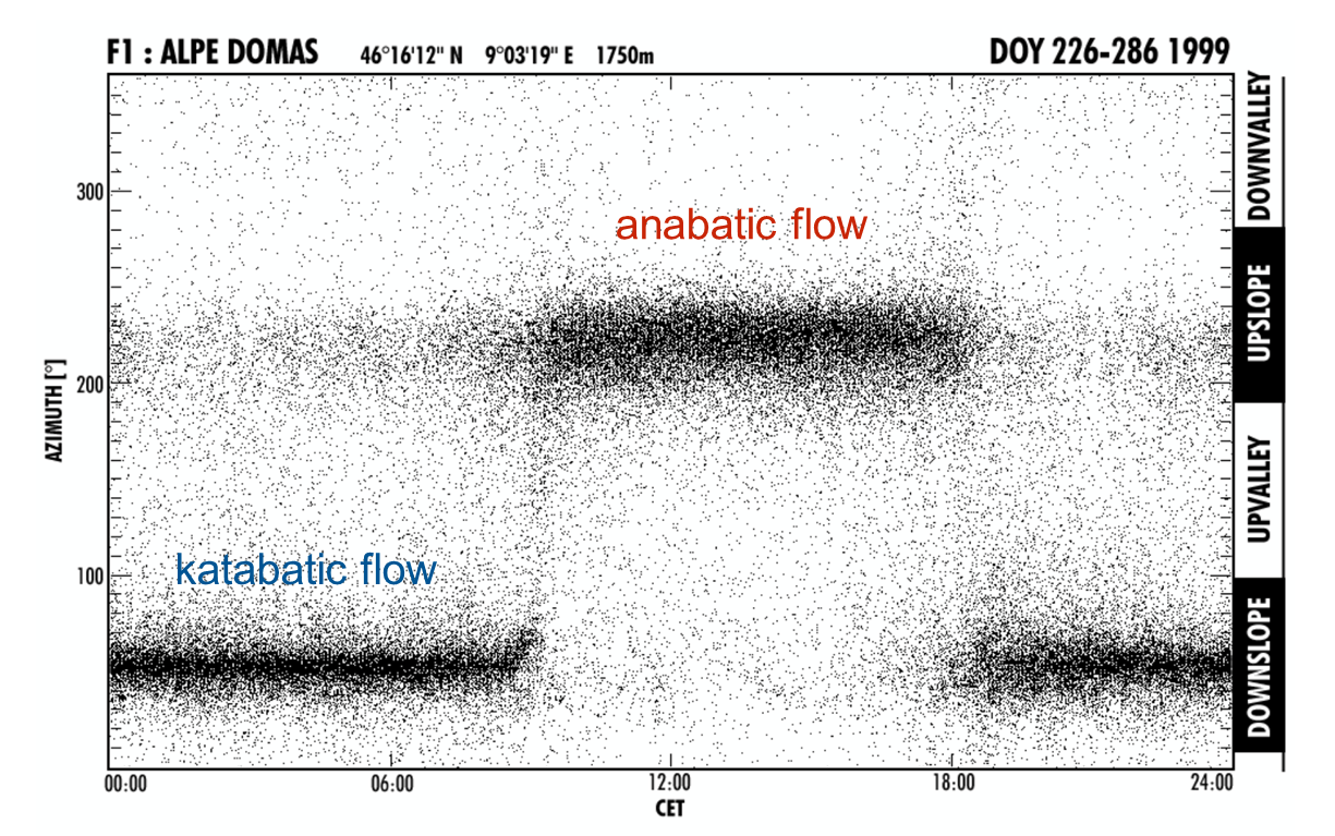 Thermo-topographic flows form along slope and valley axes under fair-weather situations with limited synoptic wind. Anabatic flows are upslope, katabatic flows downhill.