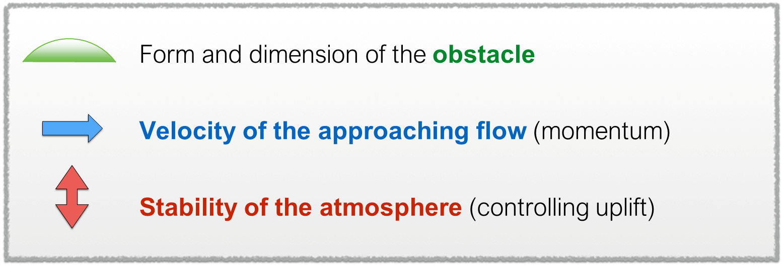 Controlled by the dimension and form of the orographic obstacle and the atmospheric conditions.
