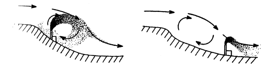 If the slopes are forested, the maximum wind speed can be found in the trunk space of a forest. On steeper slopes, however, more substantial flows are observed, and a large number of smaller circulations can establish.
