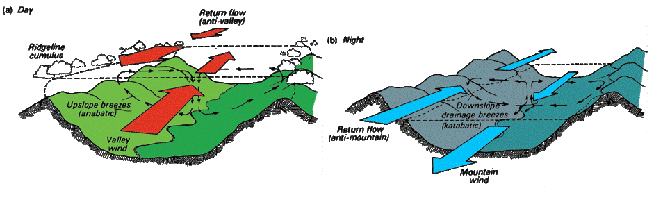 By day, in mountainous areas, the air at higher elevation warms more rapidly than that down the valley triggering up-slope (anabatic) flow and also up-valley flow. At night the rapidly cooling air on mountains flows down by gravity (katabatic flows) and combines to form mountain winds flowing down the main valley