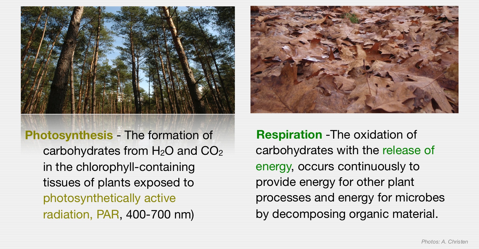 Ecosystems take up CO2 by photosynthesis and release it by respiration.